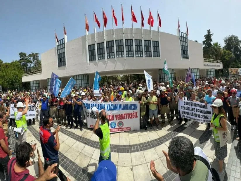 İzmir Büyükşehir Belediyesi ile Tüm Bel-Sen arasında yaşanan toplu sözleşme anlaşmazlığında günlerdir eylemlerini sürdüren kamu çalışanları bugün de, mesleki kıyafetleri ile belediye yönetimine tepkilerini sergilediler.