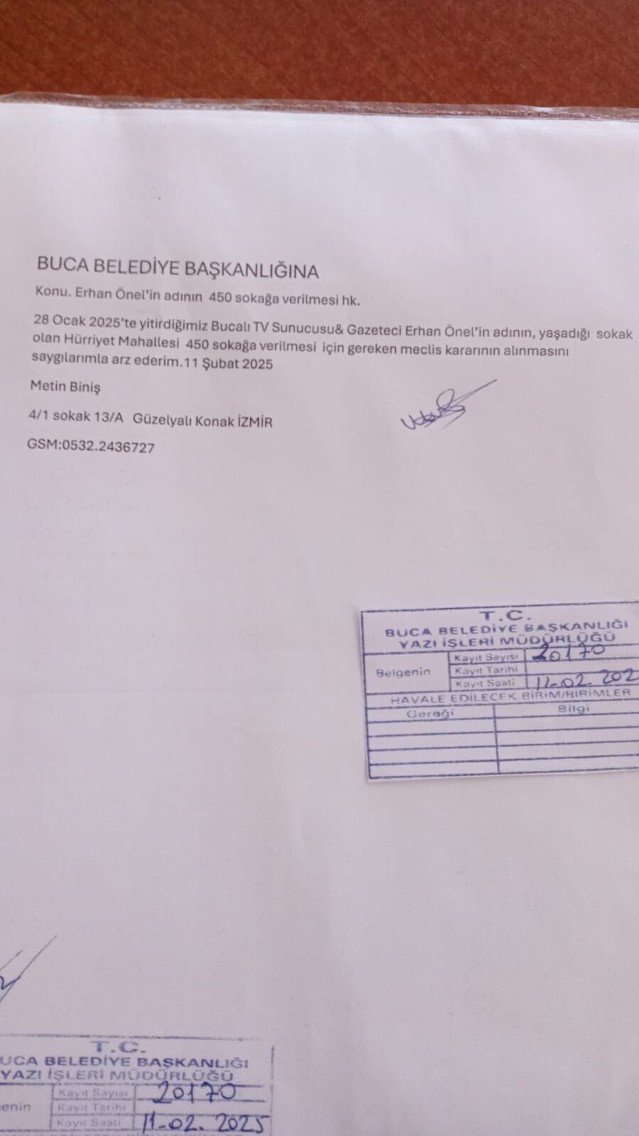 Genç yaşta kaybettiğimiz Erhan Önel’in adının Buca Şirinyer’de yaşadığı baba evinin de bulunduğu sokağa verilmesi için Buca Belediyesi’ne başvuruda bulunuldu. Buca Belediye Başkanlığı’na hitaben başvuru dilekçesini 11 Şubat 2025 günü Yazı İşleri Müdürlüğü’ne veren Eğitimci Metin Biniş, yazısında “28 Ocak 2025’te yitirdiğimiz Bucalı TV Sunucusu ve Gazeteci Erhan Önel’in adının yaşadığı sokak olan Hürriyet Mahallesi 450 Sokak’a verilmesi için gereken meclis kararının alınmasını saygılarımla arz ederim” ifadelerini kullandı.